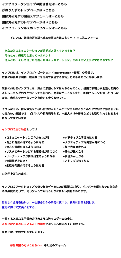 名古屋で開催されるインプロ・ワークショップ情報です。 管理人の主催する「講師力研究所」の講演会の情報も載ってます♪